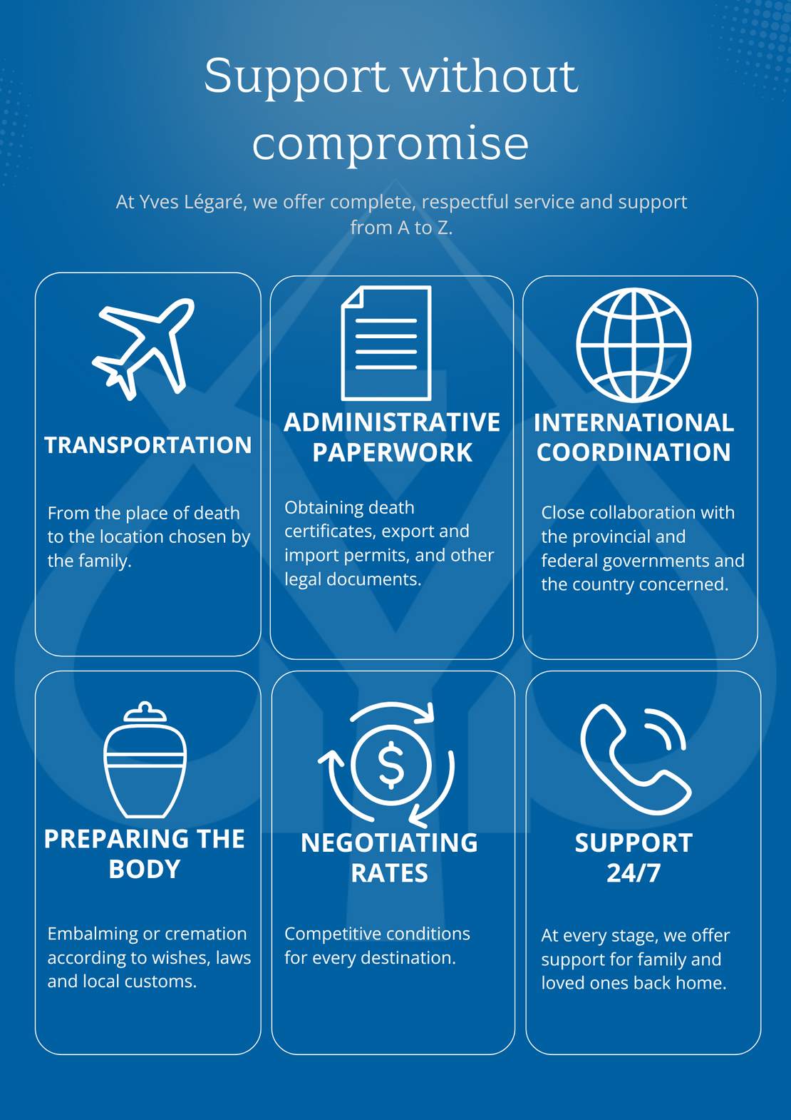 At Yves Légaré, we offer a complete repatriation service, along with comprehensive support from start to finish, to assist you in these difficult times.
