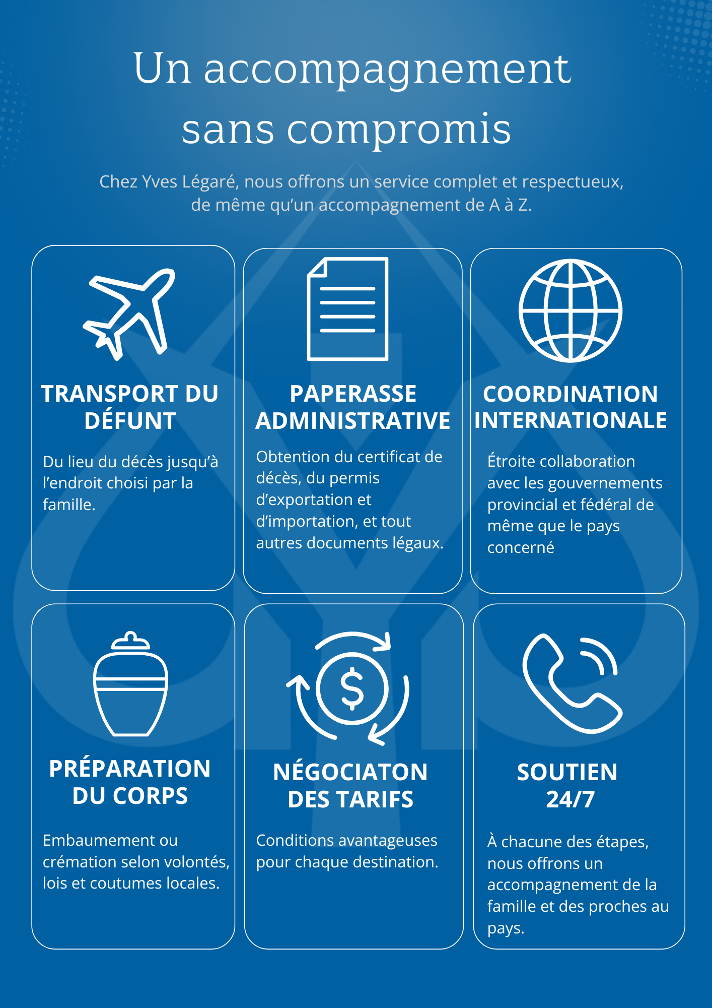 Le Service rapatriement de corps international des Complexes funéraires Yves Légaré se consacre à fournir une assistance funéraire internationale complète, et ce, sans limite géographique. Que ce soit pour un retour au pays ou pour répondre au souhait d’être inhumé en terre natale, nos experts multilingues collaborent étroitement avec les familles ainsi qu’avec des partenaires partout à travers le monde.